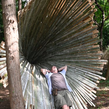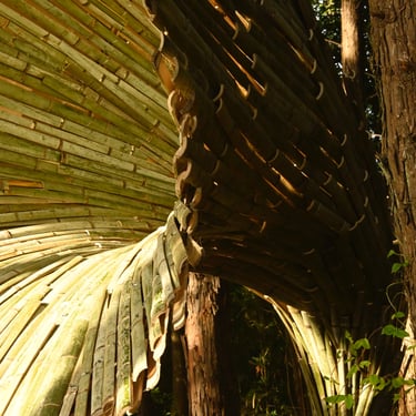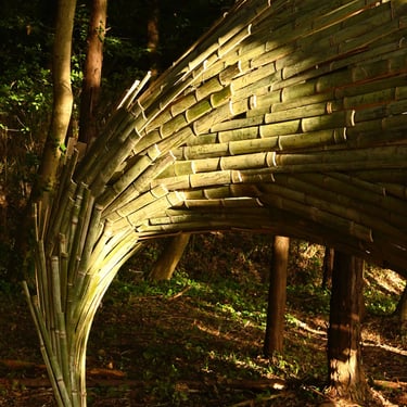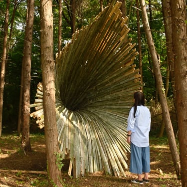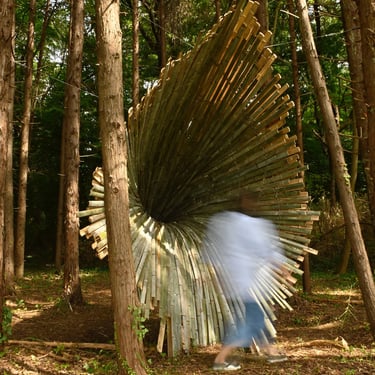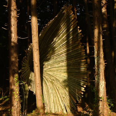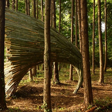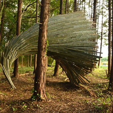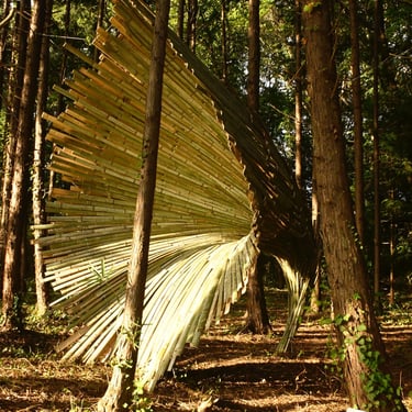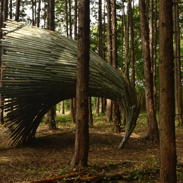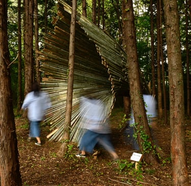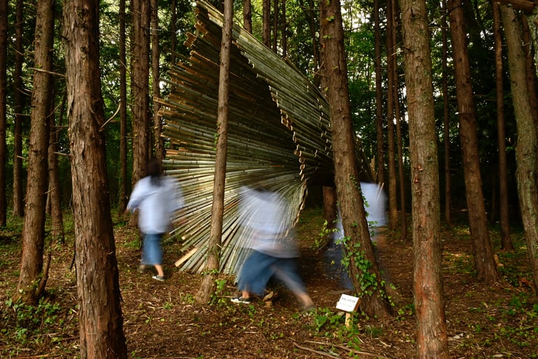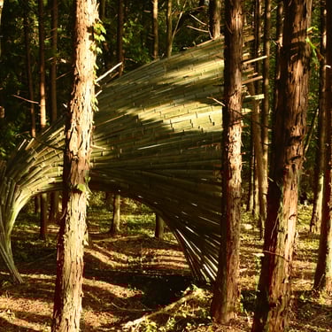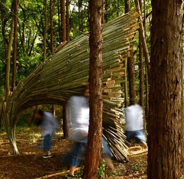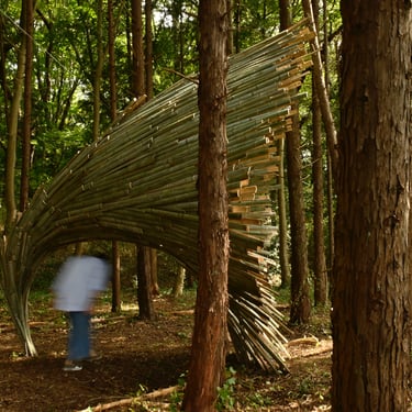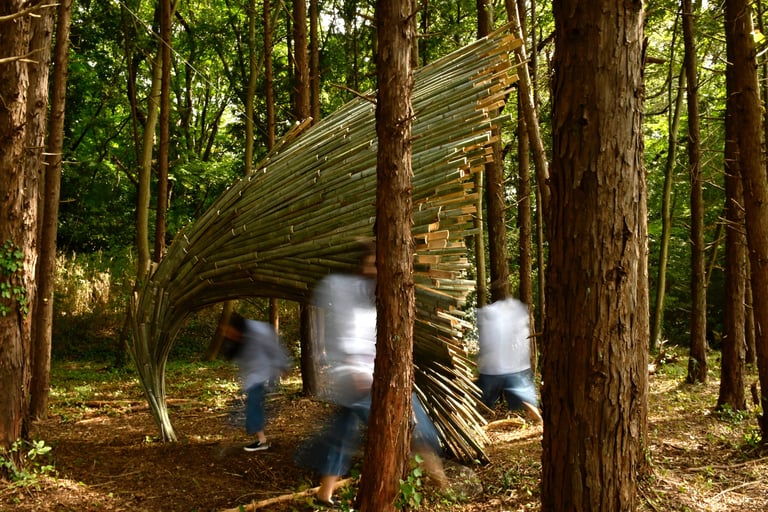 "Untamed Frequencies" is a land artwork made of bamboo and rebar, set in a pine forest. It contrasts the natural flexibility of bamboo with the industrial strength of rebar, symbolizing the relationship between nature and humanity. The installation invites reflection on harmony and discord in the natural environment.