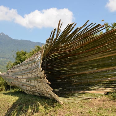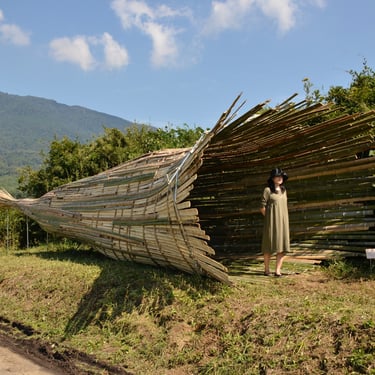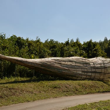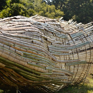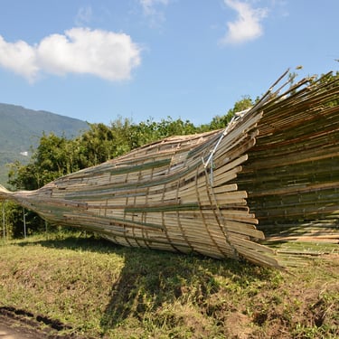 Hearing the Tsukuba san speech . . (2017), bamboo, glass, mixed media, about 1500 cm x 300 cm x 300 cm.